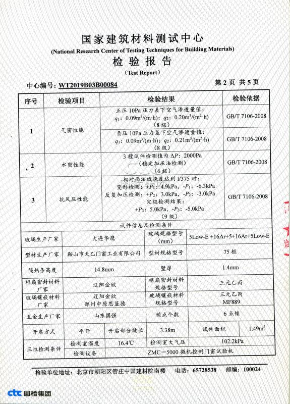 天乙門窗合成木包鋁窗國家建筑材料測試中心檢測報告